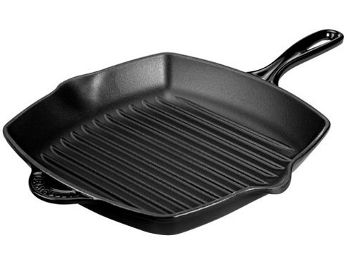 By squaring this skillet and flaring its sides, famed French cookware manufacturer Le Creuset offers extra cooking room for steaks, fish, burgers, or any food that benefits from stovetop grilling and the caramelized flavor imparted by seared grill marks. The ribs in the grill's bottom not only provide those marks but also elevate foods so that fat collects between them for low-calorie cooking. Because cast iron is unmatched for heat retention and even distribution--no hot spots--foods will cook uniformly in the 10-1/4-inch-square grill. Enameled outside with a matte surface and inside with a black satin-texture finish, this is a heavy, durable grill that works on any stovetop, in the oven, or under a broiler. It's also stylish enough (think French farmhouse kitchen) to bring to the table. Though it's dishwasher-safe, hand washing preserves a patina that builds up with use and aids in the grill's stick resistance. --Fred Brack